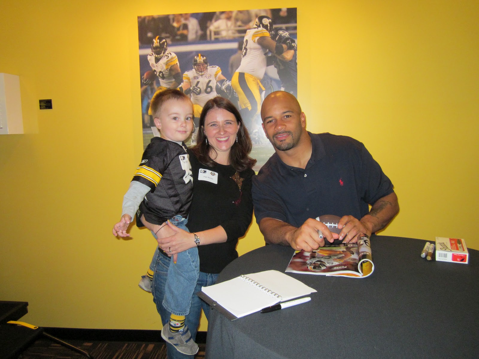 All the staff was so nice and everyone was so nice to my son. Even though the invite said in big letters “CHILDREN ALLOWED” my son was the only young child there, maybe even the only child there. I couldn’t believe it. They brought out the speaker. It was Larry Foote Defenesive lineman for the Steelers. The representative from Klout was there and actually gave us some interesting info. He said the Steelers have the #1 female fan base among all the teams in the NFL! I was excited about that. They said most of the NFL teams have a 46% – 54% ratio with the higher portion being the guys. He said with the Steelers it’s the exact opposite. After they were done speaking we had a chance to actually meet Larry Foote and he signed autographs for us.
