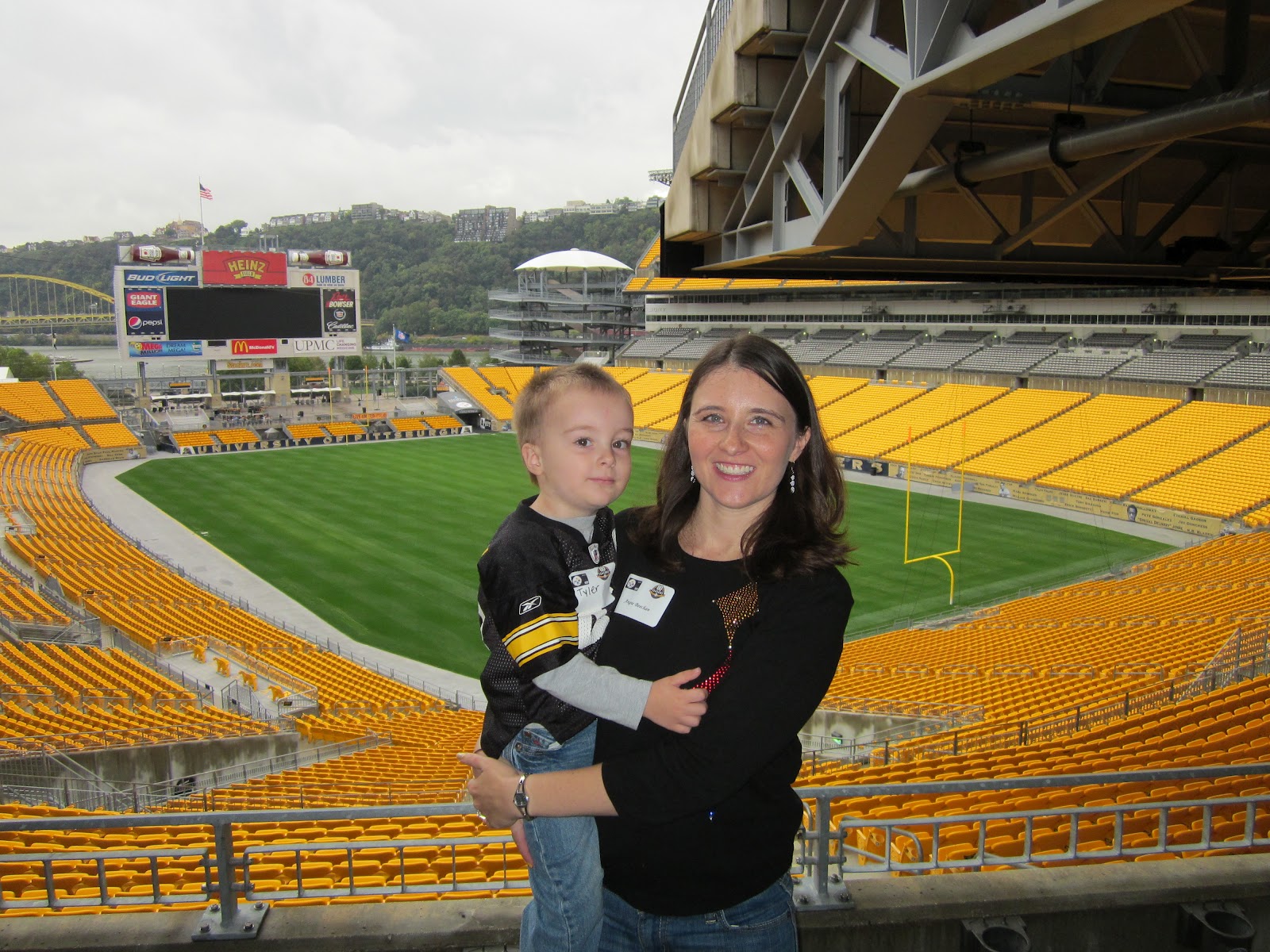 Then they had the raffle drawing. My son was super excited that he won a Steelers Terrible Towel. They allowed us to take out time and eat as much as we wanted and we got to go out where the season ticket holders sit. There was so many nice people there. Once lady offered to take a picture of my son and I with the field in the background.