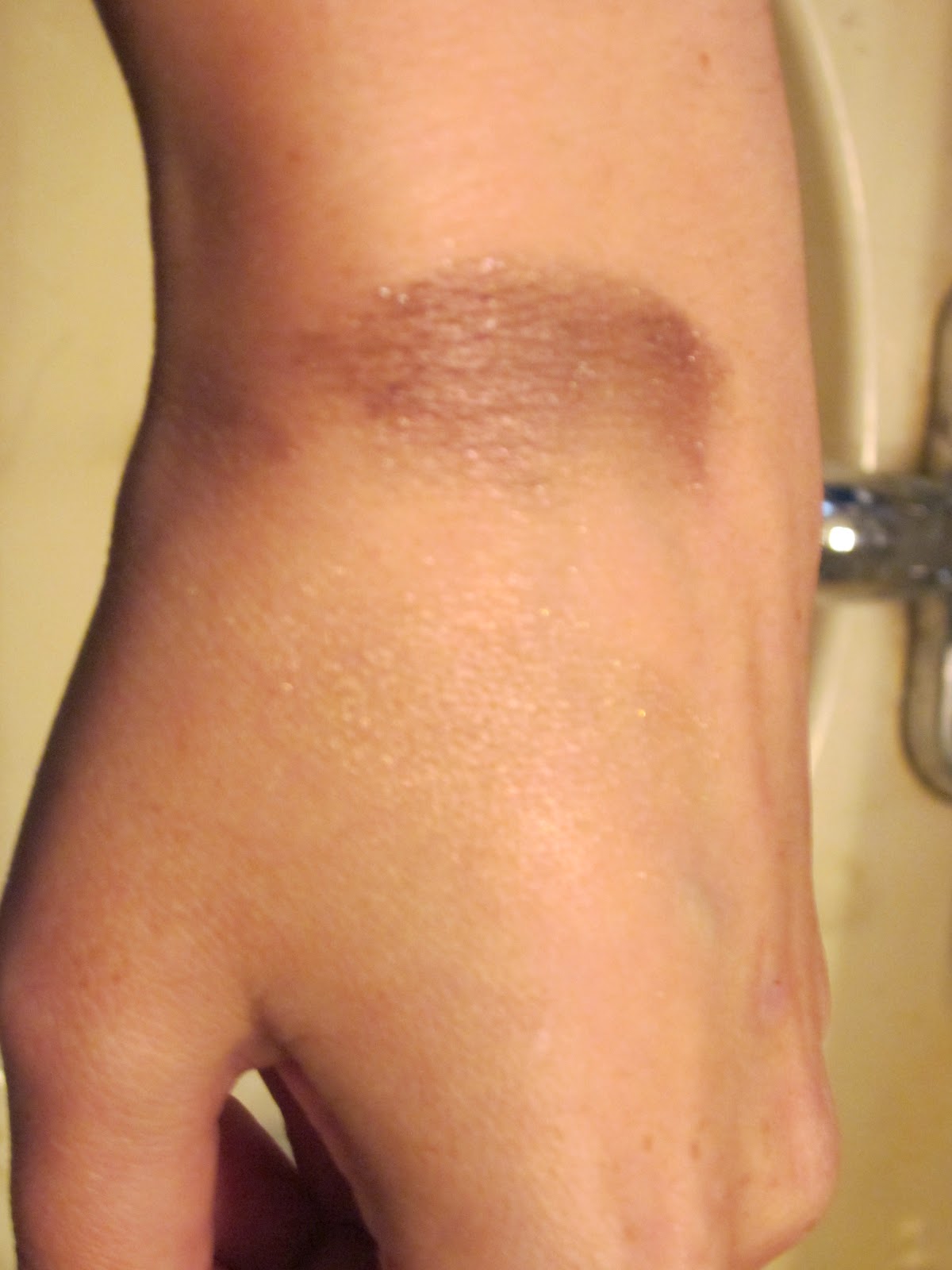 I did a swatch of the 2 shadow liners on the back of my hand hoping it might be a little easier for you to see. Mora is a dark chocolate brown with a hint of plum in it. Caramelo is a very light beige. On my skin the Caramelo just kind of shows up as a shimmer. The Caramelo is below the darker Mora color and you can just kind of see the shimmer on my skin.