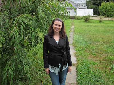 It comes in blue and black. I chose the black because I thought it to be more versatile. This jacket is a heavier material (cotton/polyester). It has a silky shiny finish that almost reminds me of satin. A feature that I love is that it’s machine washable. No extra money spent at the dry cleaner. The pocket on the outside are just decorative and are not functioning pockets which is the only drawback for me. It’s a really well made jacket and will be perfect for the chillier fall weather coming up. Ok I showed you the model, now here I am sporting my new coat from