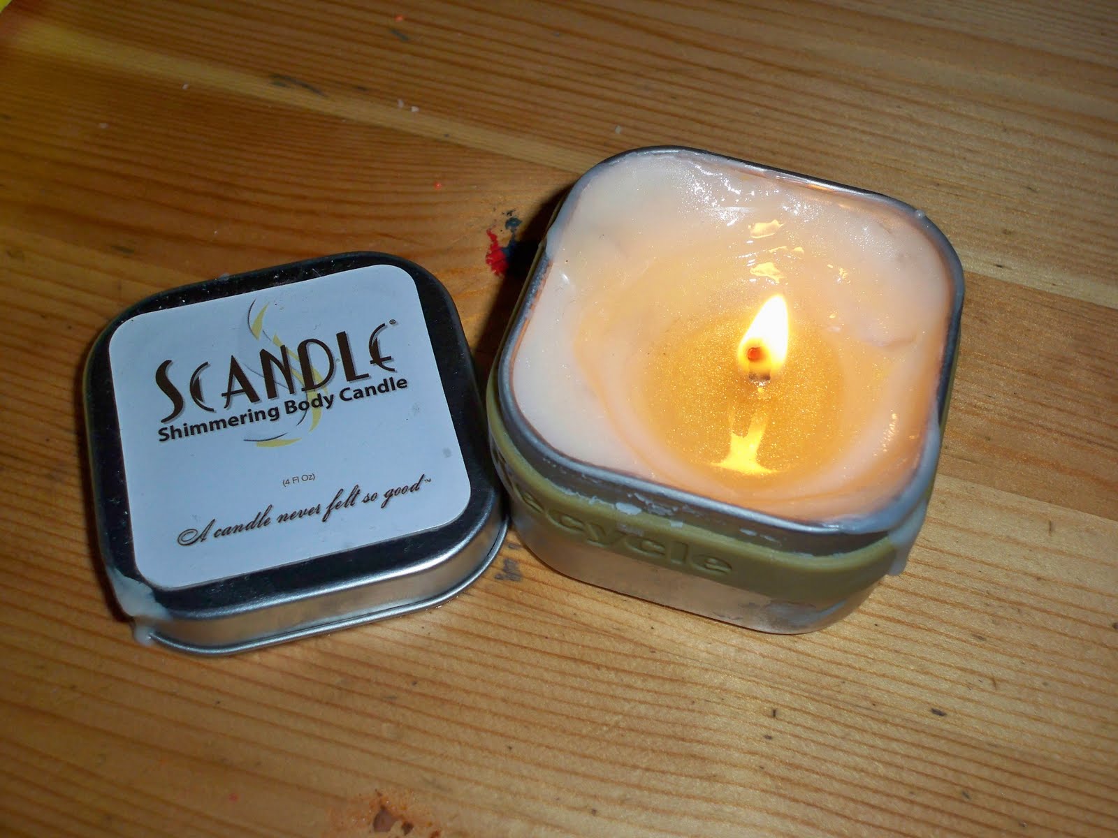 My husband agreed to be my test subject. I really wondered how easy it would be to work with during a massage. I’m still in the frame of mind of a “regular” candle at this point thinking “won’t it start to harden?”, I’m sure it’s not going to lubricate well.” Well I was wrong on both accounts. Scandle Candle recommends letting the Shimmering Lotion Candle burn for 30 minutes or until it metls to the sides of the container. You then blow out the candle. You can pour the melted candle into your hand and use. It was a great massage oil. With one small palm full i was able to massage his back and arms completely and for about 10 minutes. At this point I didn’t tell him it was a Shimmering Lotion Candle because I was afraid he wouldn’t let me use it on him lol.